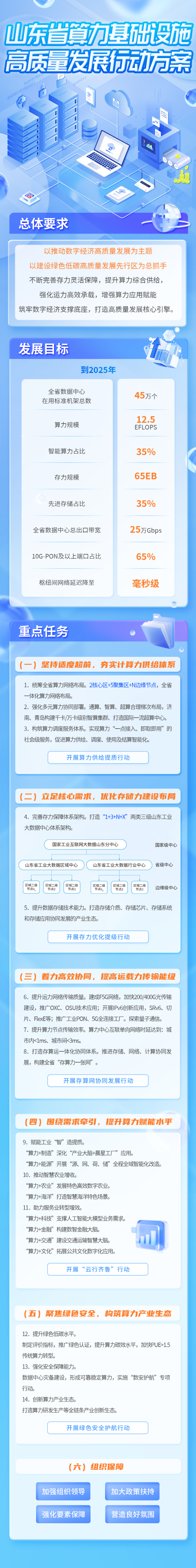 行動方案以推動數字經濟高質量發展為主題,以建設綠色低碳高質量發展先行區為總抓手,通過不斷完善存力靈活保障,提升算力綜合供給,強化運力高效承載,增強算力應用賦能,統籌通用算力、智能算力、超級算力協同計算,大中小城市協同布局,算力、數據、算法協同應用,以筑牢數字經濟支撐底座,打造高質量發展核心引擎。方案明確了夯實計算力供給體系、優化存儲力建設布局、提高運載力傳輸能級、提升算力賦能水平、構筑算力產業生態、組織保障等6方面重點任務,部署了算力供給提質、存力優化提級、存算網協同發展、“云行齊魯”、綠色安全護航等5大行動。