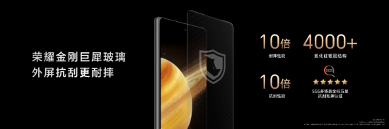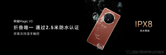 更為出色的是,榮耀Magic V3搭載的是輕薄折疊鉸鏈結構,厚度僅有2.84毫米,采用強度高達2100Mpa的第二代榮耀盾構鋼,抗沖擊性能提升100%。手機機身更是業界首創航天特種纖維,抗沖擊性能是iPhone 15 Pro Max的40倍。在屏幕保護上,榮耀Magic V3的外屏采用榮耀金剛巨犀玻璃,基于第二代納米微晶玻璃技術,全場景抗跌能力提升了10倍,同時使用氮化硅鍍晶技術,獨創4000+疊層設計,實現10倍抗刮耐摔;內屏搭載榮耀金剛柔性裝甲,通過抗沖硅凝膠材料+納米級氧化鋁涂層,耐磨和抗沖擊性能分別提升5倍和20%。此外,榮耀MagicV3的榮耀魯班鉸鏈經過了50萬次折疊測試,1萬次彎折測試后,屏幕折痕深度控制出色,僅為78微米;且產品支持IPX8防水等級,成為唯一通過2.5米防水認證的折疊屏手機,為用戶提供了全面、安心的折疊屏使用體驗。