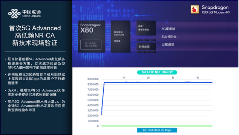 MWC上海展前夕,中國聯通研究院聯合高通完成首次5G-A高低頻NR-CA新技術現場驗證,利用了高頻段的800MHz帶寬與3.5GHz低頻段的100MHz帶寬進行載波聚合,在采用搭載驍龍X80調制解調器及射頻系統的智能手機形態終端上實現了超過8.5Gbps的單用戶下行峰值速率,為XR、裸眼3D等5G-A大帶寬新業務提供了沉浸式體驗的保障。