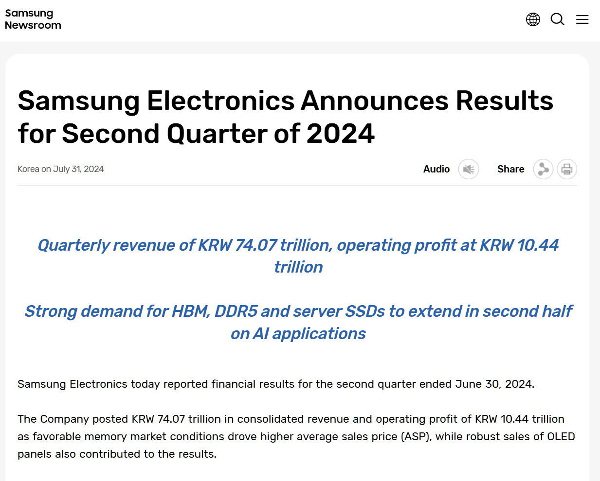 三星電子今年Q2凈利潤9.64萬億韓元,銷售額74.07萬億韓元