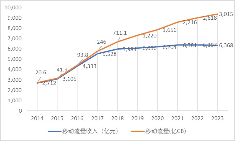 與此同時,運營商從3G、4G以來的流量經營策略也接近峰頂。據工信部發布的數據,國內移動流量增幅在2022年、2023年持續縮小,低至18.1%和15.2%,對應的移動流量收入也從2022年的微增變成了2023年的微降。