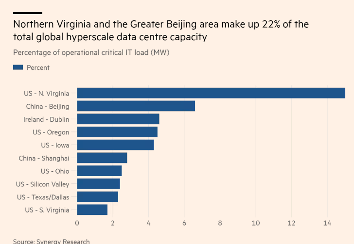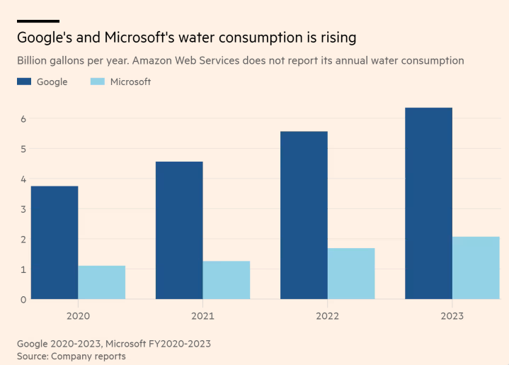 根據 FT 報道,世界上最大的數據中心集中地美國弗吉尼亞州,2019 年至 2023 年期間,用水量增加了近三分之二,從 11.3 億加侖增至 18.5 億加侖。