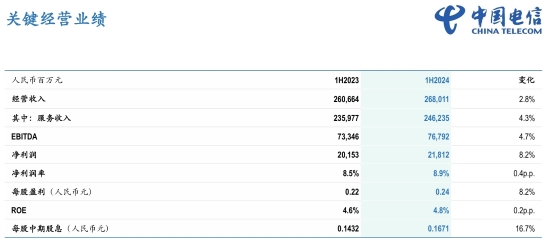整體來看,2024年上半年,中國電信經營收入為人民幣2680億元,同比增長2.8%,其中服務收入為人民幣2462億元,同比增長4.3%,持續高于行業增幅。EBITDA為人民幣768億元,同比增長4.7%。凈利潤為人民幣218億元,同比增長8.2%,每股基本凈利潤為人民幣0.24元。資本開支為人民幣472億元,自由現金流為人民幣155億元。