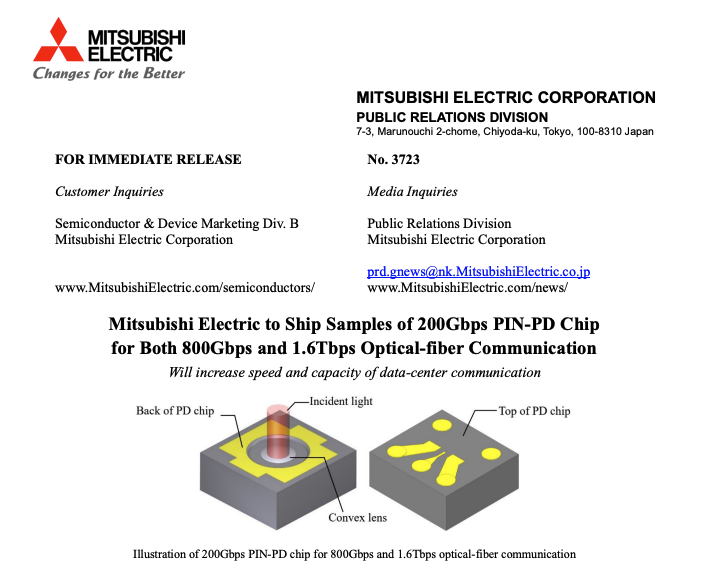 三菱電機(jī)也在周二宣布,從今年10月開始,將開始出貨用于800Gbps和1.6Tbps光纖通信的200Gbps PIN-PD芯片樣品。也就是說,配備4個(gè)新PD芯片的光收發(fā)器可實(shí)現(xiàn)800Gbps通信,使用8個(gè)芯片則能讓通信容量再翻一倍。