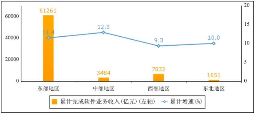 西部、東北地區軟件業收入增速小幅提升。1—7月,東部地區完成軟件業務收入61261億元,同比增長11.4%,增速較上半年回落0.5個百分點;中部地區完成軟件業務收入3484億元,同比增長12.9%,增速較上半年回落0.3個百分點;西部地區完成軟件業務收入7032億元,同比增長9.3%,增速較上半年提升1.1個百分點;東北地區完成軟件業務收入1651億元,同比增長10%,增速較上半年提升0.3個百分點。4個地區軟件業務收入在全國軟件業務總收入中的占比分別為83.4%、4.7%、9.6%和2.2%。