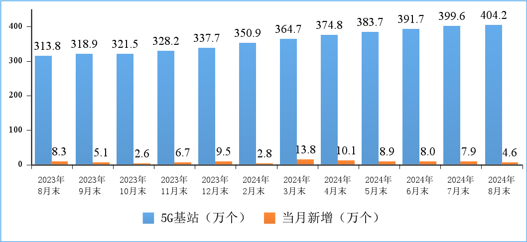 5G網絡建設持續推進。截至8月末,5G基站總數達404.2萬個,比上年末凈增66.5萬個,占移動基站總數的32.1%,占比較上年末提高3個百分點。