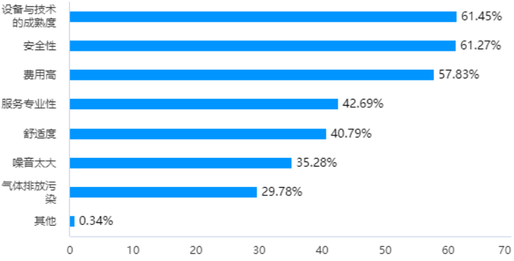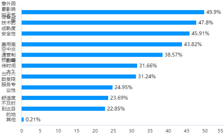 調查顯示,天氣等意外因素影響、設備與技術的成熟度、費用高、安全性、是交通出行場景下消費者最大的顧慮因素。