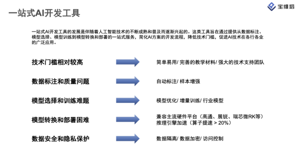 然而,對于很多企業來說,專業領域AI模型從開發到落地的每一環都絕非易事。一般而言,主要分為數據分析和數據標注、模型選擇、訓練框架選擇和模型訓練、模型轉換、模型部署這五個步驟,而每個步驟中都存在實操過程中的難點,像是數據標注過程要根據數據特點確定檢測類型,又比如模型的選擇本質上是一個折中或妥協的過程,要根據場景需求選擇最合適的算力終端。另外在模型轉換的過程中也會涉及到不同的硬件平臺,對應支持的格式也存在差異。