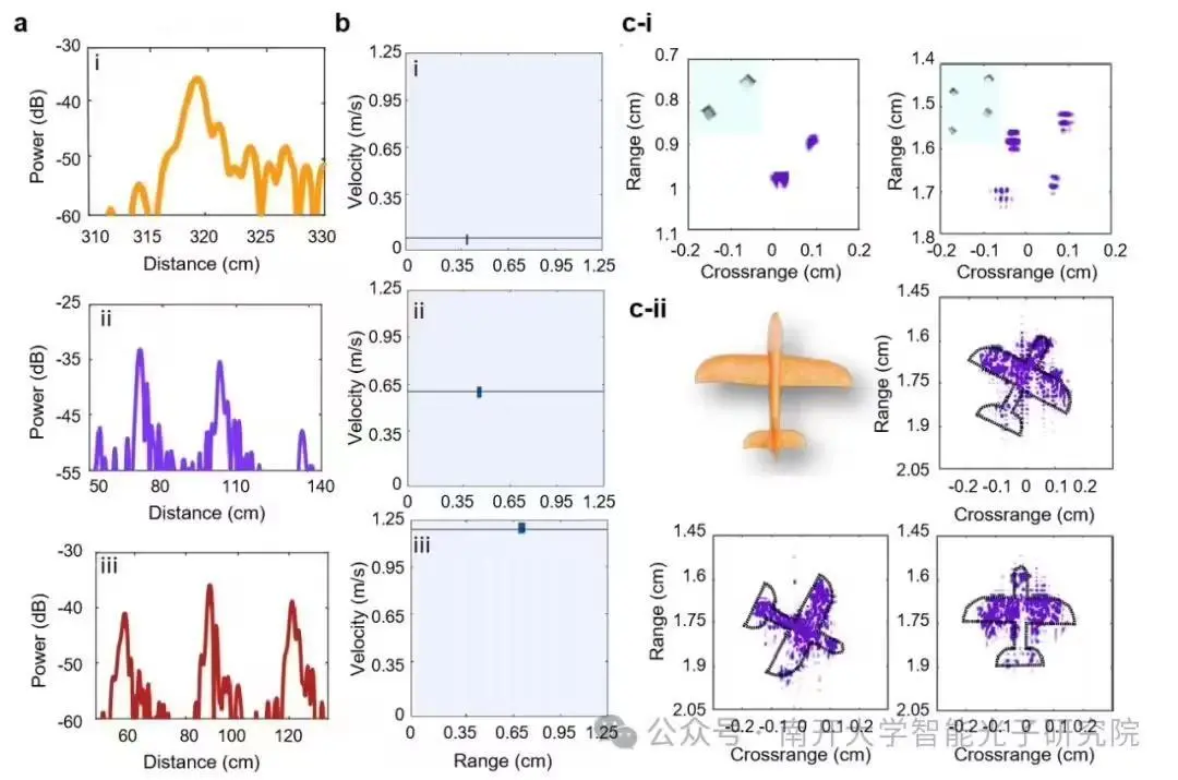 實驗結果顯示,此集成光子毫米波雷達在測距、測速及成像功能的分辨率均超越厘米級,距離分辨率達 1.5 cm,速度探測分辨率達 0.067 m/s,逆合成孔徑雷達二維成像分辨率達 1.5 cm × 1.06 cm,與傳統毫米波雷達系統和其他片上雷達芯片相比,在分辨率、靈活性和適用性方面實現了跨越式提升,能夠精準捕捉目標的細微特征,如位置、速度以及形狀與姿態,為高精度目標探測提供了強有力的支持。