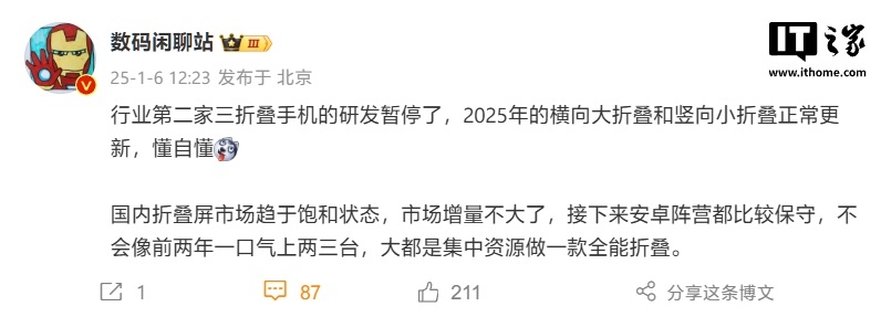 博主 @數碼閑聊站 6日午間發文披露,“行業第二家”三折疊手機的研發暫停了,2025 年的橫向大折疊和豎向小折疊正常更新。他認為,國內折疊屏市場趨于飽和狀態,市場增量不大,接下來安卓陣營都比較保守,不會像前兩年一口氣上兩三臺,大都是集中資源做一款全能折疊。