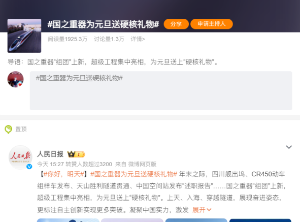 2025向新再出發!最近,#國之重器為元旦送硬核禮物#登頂微博熱搜榜,四川艦出塢、CR450 動車組樣車發布、天山勝利隧道貫通、中國空間站發布 “述職報告”等國之重器 “組團”上新,超級工程集中亮相,為新年獻上了一份份 “硬核禮物”,帶給國人滿滿的驕傲與自豪!