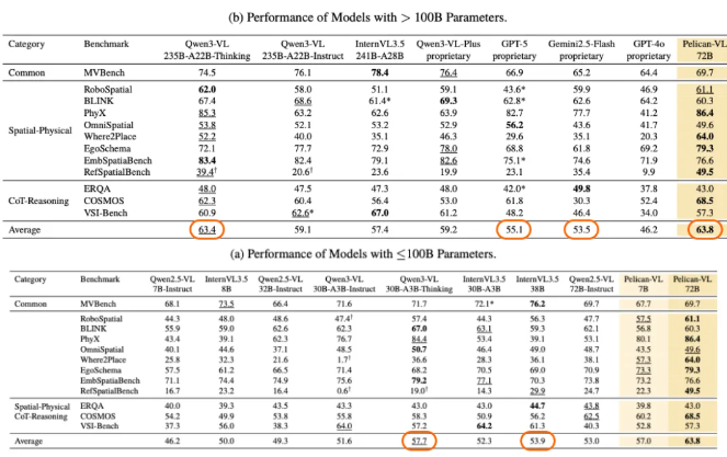 本次開源的 Pelican-VL 1.0 的核心優(yōu)勢在于深度整合海量數(shù)據(jù)與自適應(yīng)學(xué)習(xí)機(jī)制,在由 1000+ A800 GPU 組成的集群上訓(xùn)練,單次檢查點訓(xùn)練耗費(fèi)超過 50,000 A800 GPU-小時;團(tuán)隊從原始數(shù)據(jù)中蒸餾出的包含數(shù)億 token 的高質(zhì)量元數(shù)據(jù)以做訓(xùn)練基石;谏鲜鰞(yōu)勢,Pelican-VL 1.0 實現(xiàn)了在基線基礎(chǔ)上性能提升 20.3%,平均超過 Qwen3-VL 系列、InternVL3.5 系列等同級別開源模型 10.6%。