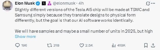 馬斯克寫(xiě)道:“臺(tái)積電(294.05, -10.81, -3.55%)和三星將生產(chǎn)略有不同的特斯拉AI5芯片版本,因?yàn)樗鼈儗⒃O(shè)計(jì)轉(zhuǎn)化為物理形式的方式不同,但目標(biāo)是我們的AI軟件工作方式相同。
