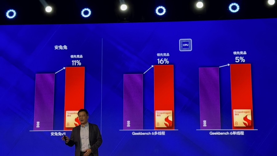 另外,與競品相比,第五代驍龍8安兔兔分數領先11%,Geekbench 6多線程分數領先16%,單線程分數也領先競品5%。在CPU多線程能效的部分,第五代驍龍8和競品相比,達到相同峰值性能的情況下,功耗領先36%;而在功耗相同的情況下,性能領先12%。