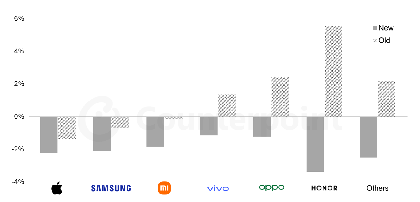 Counterpoint 指出,內存芯片短缺對智能手機市場的沖擊將呈現結構性差異,其中榮耀、OPPO 等中國品牌因利潤率較低,抗風險能力相對更弱,中低端入門機型受到的影響尤為顯著。