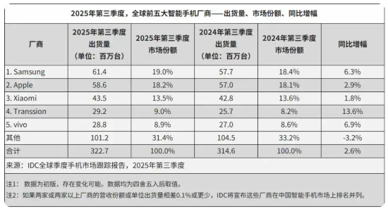 經歷連續多年的市場調整后,全球智能手機行業在2025年迎來明確的復蘇信號,這種復蘇并非簡單的量能回升,而是伴隨結構優化的高質量增長。從全球市場來看,IDC公布數據顯示,今年第三季度全球智能手機出貨量同比增長2.6%,結束了此前的波動調整態勢,復蘇動力主要來自兩方面:一是積壓的換機需求逐步釋放,二是頭部廠商的AI創新與形態升級有效激活了消費意愿,AI手機、AIPC、AI眼鏡等新形態設備加速落地,行業競爭從單一產品比拼,轉向以全場景體驗為核心的生態構建。