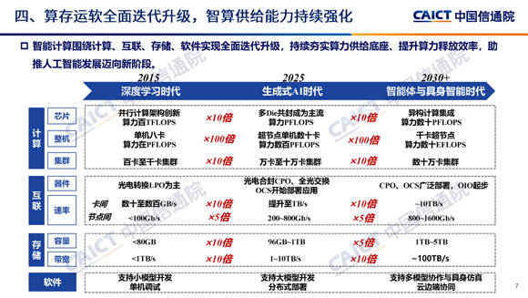 智能計算圍繞計算、互聯(lián)、存儲和軟件全面迭代升級,推動生成式AI邁向智能體和具身智能時代。計算上,單卡多芯片成為主流,超節(jié)點爆發(fā),萬卡集群加速構(gòu)建,2030年異構(gòu)計算集成是主流,整機和集群容量大增;數(shù)據(jù)中心互聯(lián)呈現(xiàn)光電融合趨勢,速率提升顯著;存儲容量和帶寬大幅提升;軟件向多模態(tài)協(xié)作等方向發(fā)展。網(wǎng)絡(luò)能力持續(xù)發(fā)展,支撐萬物智聯(lián)與AI發(fā)展,移動和固定寬帶向萬兆提升,骨干網(wǎng)絡(luò)加速向超寬帶全光底座演進,推進算網(wǎng)融合,以實現(xiàn)泛在連接與算力資源敏捷供給。