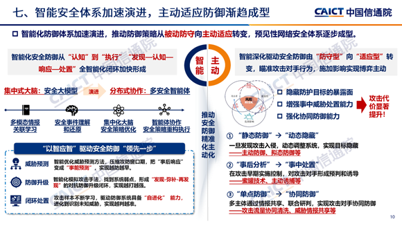 智能化安全防御從認(rèn)知到執(zhí)行的全智能化閉環(huán)正加快形成。借助安全大模型實(shí)現(xiàn)多模態(tài)學(xué)習(xí)與事件理解,催生多安全智能體協(xié)作,完成策略重構(gòu),實(shí)現(xiàn)威脅預(yù)測(cè)、防御升級(jí)與閉環(huán)處理,“以智應(yīng)智”驅(qū)動(dòng)安全防御“領(lǐng)先一步”。