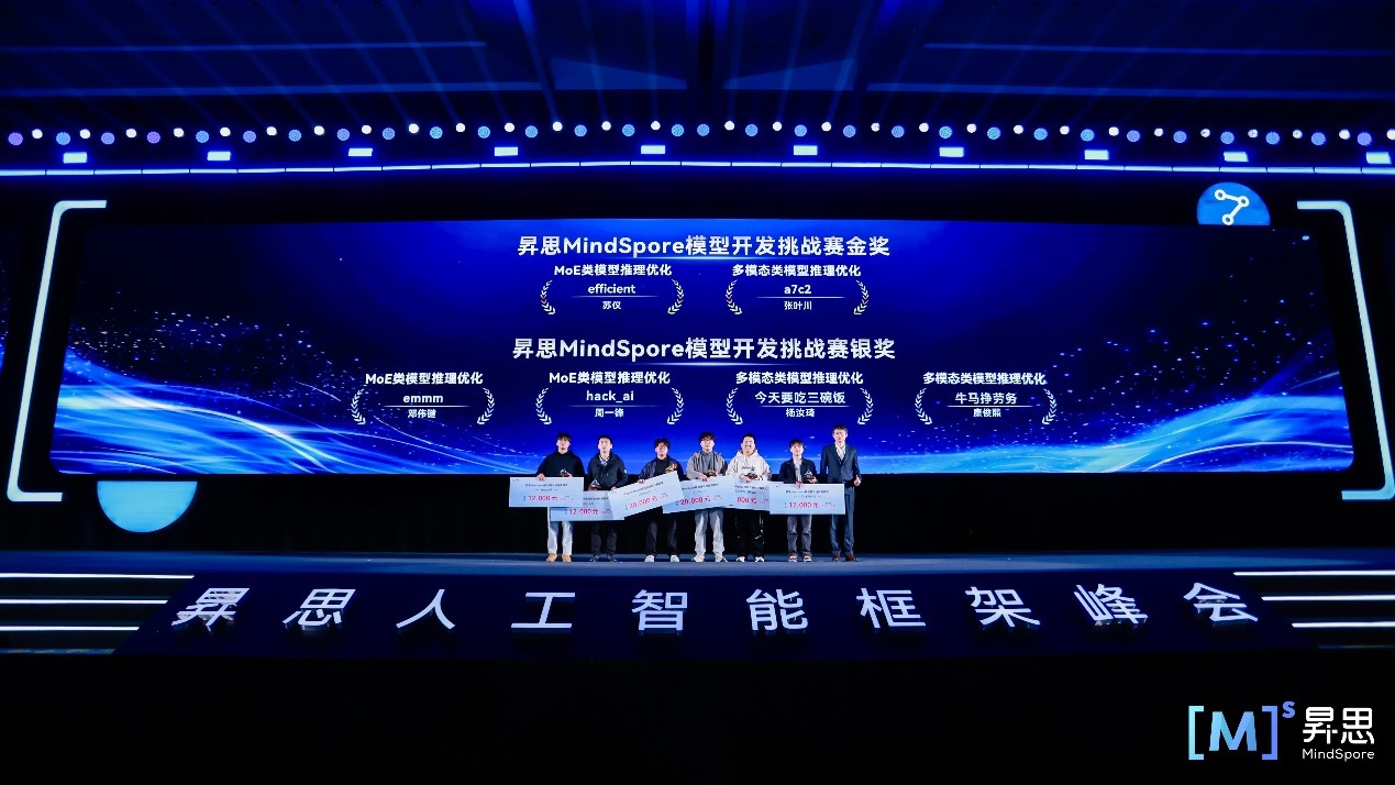 昇思MindSpore模型開發挑戰賽聚焦前沿的MoE類和多模態類模型,考驗參賽隊伍在模型推理優化方面的實戰能力,峰會上,本次挑戰賽的金獎、銀獎獲獎選手接受頒獎。