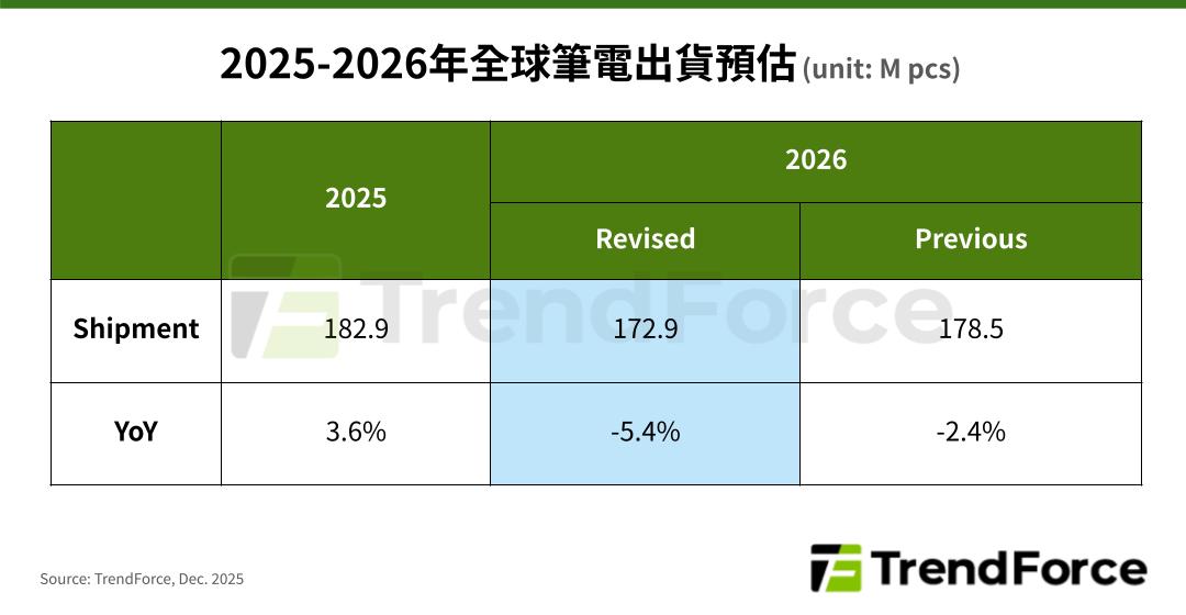 12 月 30 日消息,TrendForce 集邦咨詢今日再次下調了對 2026 年全球筆記本電腦出貨規模的預測,同比降幅從此前的 2.4% 擴大至 5.4%,對應 1.729 億臺。
