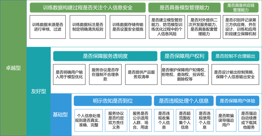 保護友好型:在基礎型之上,聚焦用戶權(quán)利響應、輸出管理等,評估 19 方面能力,53 項具體要求。
