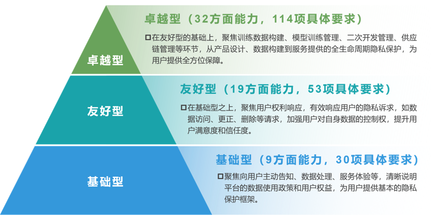 保護基礎型:聚焦向用戶主動告知、數(shù)據(jù)處理、服務體驗等,評估 9 方面能力,30 項具體要求。