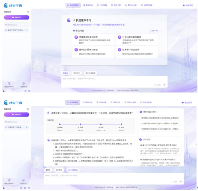 “建審千詢”垂直領域大模型包含“建審事事通、案例優選、代碼快編、報告主筆、管總北斗星、風險早知道”六大場景應用,匯聚建設工程行業數據、專業書籍、標準規范、法規制度、造價信息等百億級Tokens的高質量數據,通過了一級建造師、CPA注冊會計師和審計專業技術資格專業考試,可為審計人員提供專業知識咨詢、資料智能分析、制度匹配、問題判定、輔助決策等服務,并具備工程造價分析、建設項目風險預警等特色功能。目前,已同時融合九天大模型和DeepSeek R1大模型能力。