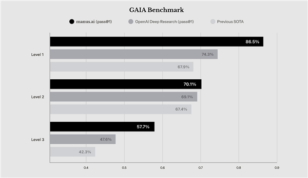 據團隊介紹,Manus在GAIA基準測試中取得了SOTA(State-of-the-Art)的成績,顯示其性能超越Open AI的同層次大模型。