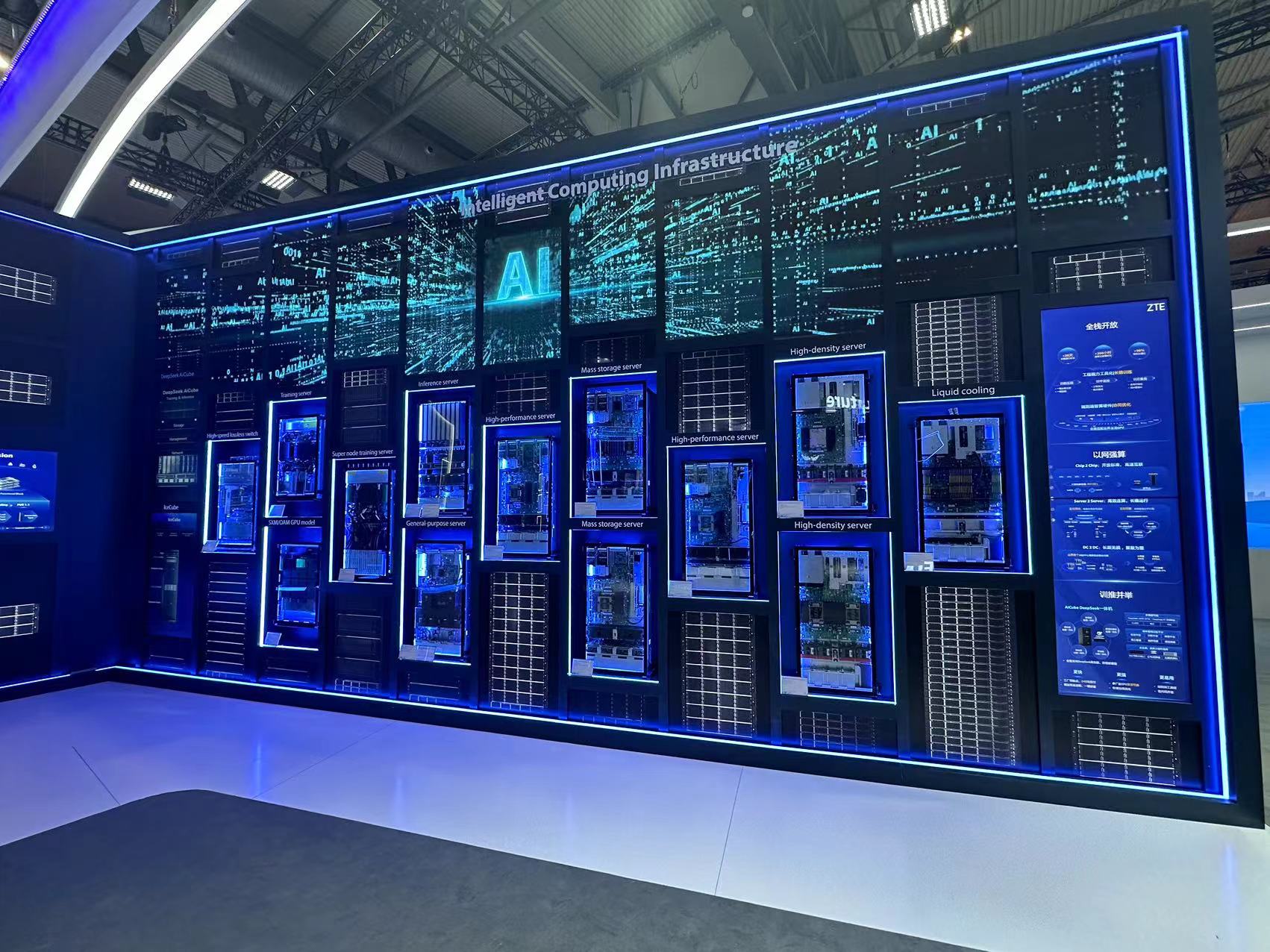 在 MWC上,不少企業展示了算力基礎設施的方案。中興通訊將智能計算定位為長期主航道,會上展出了涵蓋液冷IDC、智算服務器、通算服務器,存儲、高速交換及訓推一體機的的智算基礎設施。