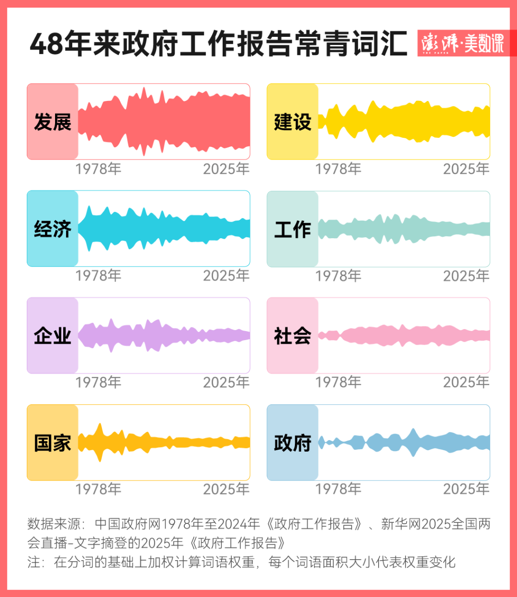 分析發(fā)現,48年間,“發(fā)展”“建設”以及“經濟”等詞匯,一直高頻出現,是《政府工作報告》中的“常青詞匯”。