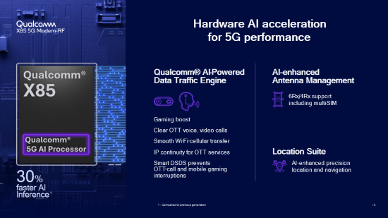 這頁幻燈片展示了高通如何利用AI提升5G性能。不久前剛剛推出的高通X85是我們最新一代5G調制解調器到天線的解決方案,搭載了高通第四代集成到調制解調器的專用AI處理器。這款處理器能夠以更高的處理性能運行更多AI專用5G算法。比如,全新的高通AI賦能的數據流量引擎,能夠利用AI處理器,增強數據流量模式識別能力,為手游用戶帶來更低時延、更快響應速度的游戲體驗。這款處理器性能強大,AI推理速度相比上一代快30%。