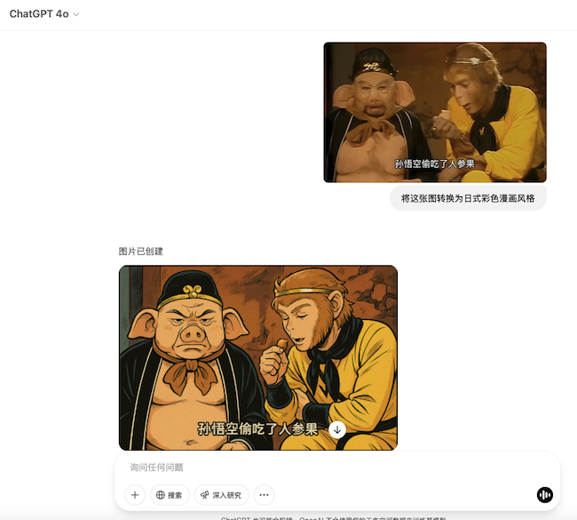 隨之被用戶發掘出最吸引人的功能便在于可以將用戶上傳的圖片,重新繪制成其他繪畫風格的作品,其中尤以漫畫風格最為討喜,于是,轉換生成的吉卜力風格作品瞬間引爆互聯網,用戶們不僅將自己的日常生活照片進行轉換,還將重要歷史時刻、網絡梗圖同樣進行了轉換,ChatGPT 4o均能做到傳神般的寫照。