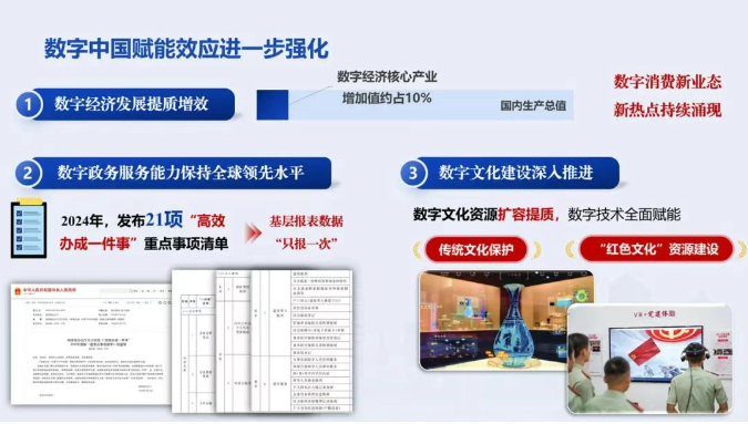 《報告》顯示,數字經濟發展提質增效,數字經濟核心產業增加值占國內生產總值比重達10%左右,數字消費新業態新熱點持續涌現。數字政務服務能力繼續保持全球領先水平,2024年共發布21項“高效辦成一件事”重點事項清單,扎實推進基層報表數據“只報一次”工作。數字文化建設深入推進,數字文化資源擴容提質,數字技術全面賦能傳統文化保護、“紅色文化”資源建設。數字社會更加普惠便捷,國家教育數字化戰略取得扎實成效,遠程醫療服務網絡已覆蓋所有市縣。數字生態文明更加綠色智慧,建成全球規模最大、要素最齊全、技術手段較先進的生態環境監測網絡,自然資源“一張圖”和數字孿生水利建設提質提速。