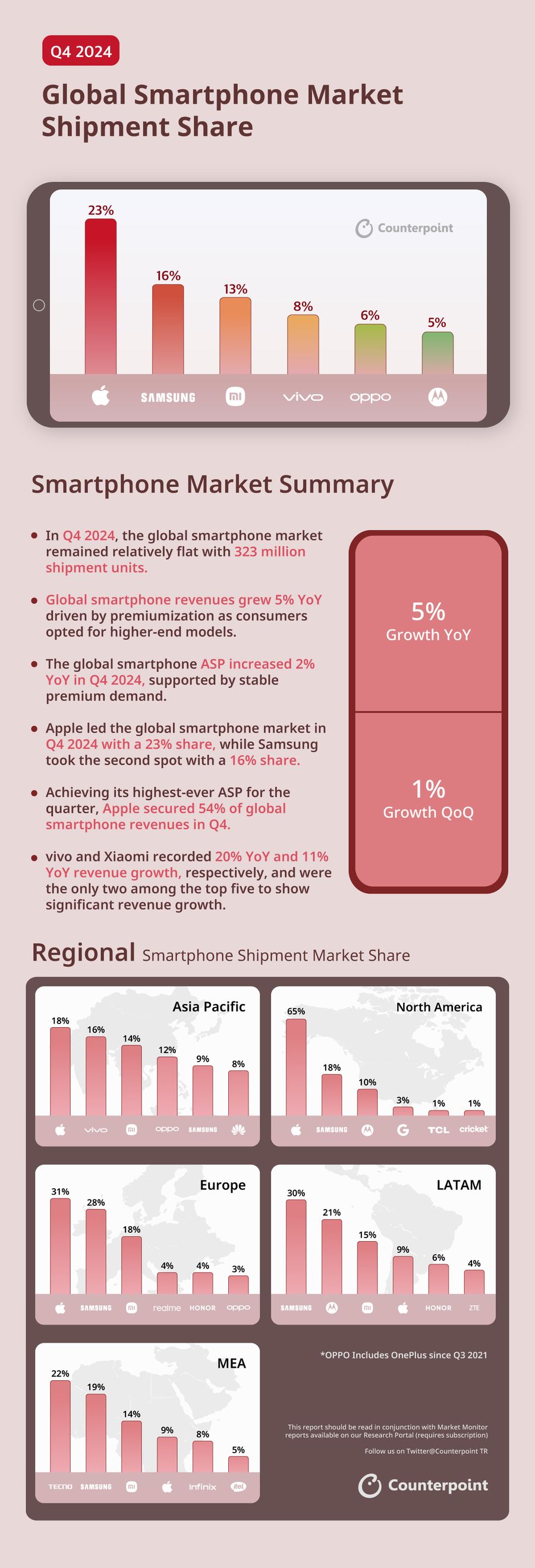 CounterPoint 報告 2024Q4 全球智能手機出貨量:蘋果市占 23%,狂攬 54% 收入