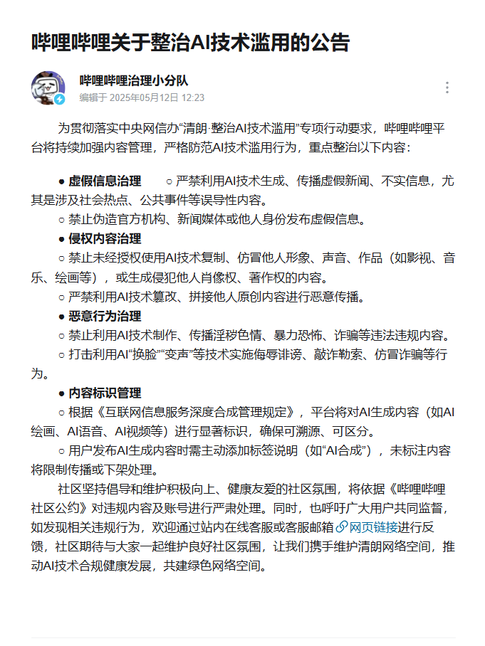 上海市委網信辦指導小紅書、嗶哩嗶哩、拼多多等 15 家重點網站平臺,集中清理“一鍵脫衣”、未經授權的人臉或人聲克隆編輯、未備案等違規 AI 產品、商品及相關營銷、炒作、推廣、教程信息。小紅書、嗶哩嗶哩主動發布專項行動治理公告,開通了有害 AI 內容的舉報受理處置渠道;星野開展智能體全面排查清理。各重點網站和 AI 平臺共攔截清理相關違法違規信息 82 萬余條,處置違規賬號 1400 余個,下線違規智能體 2700 余個。經整治,網絡違規 AI 信息顯著減少。