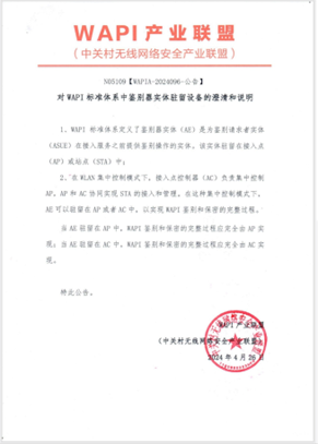 本著為產業市場負責的原則,WAPI產業聯盟于2024年4月發布了《對WAPI標準體系中鑒別器實體駐留設備的澄清和說明》公告,對AE駐留位置問題進行了預警。2025年4月發布了《WAPI市場應用洞察報告——瘦AP組網架構下的WAPI產品工程化實現與部署》,修訂并發布了《無線局域網鑒別與保密基礎結構(WAPI)功能測試項目(2025年4月版)》,增設AE駐留位置測試項。2025年5月啟動了針對AE駐留位置的WAPI瘦AP產品重新測試專項,廠商通過重測獲得聯盟最新測試報告,將更有利于滿足市場建設采購需求,提升廠商在市場中的競爭力。