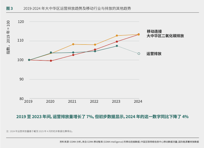 根據GSMA在2025 MWC上海期間發布的《移動凈零排放》報告,盡管自2019年以來中國移動數據流量增長近四倍,但得益于能源效率提升和可再生能源使用比例增加,中國移動運營商在2024年首次實現運營碳排放同比下降。
