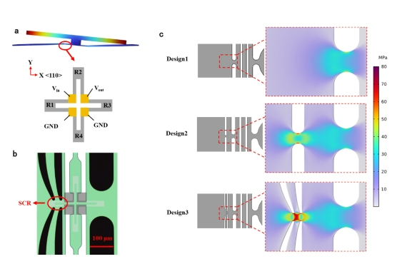 團隊從按壓手機屏幕中獲得靈感,利用硅壓阻應變原理,在 MEMS 快反鏡上集成了片上角度傳感器。通過結構創新設計,引入力學定向結構形成應力集中區域(SCR),將角度傳感器靈敏度從 3.3mV/(V・mrad) 提升至 5.4mV/(V・mrad),增幅達 63%,顯著優化了光束控制的精確性。