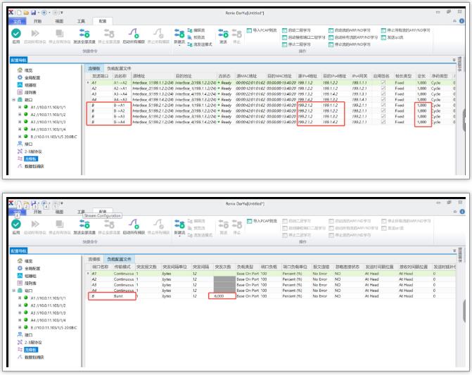 2. 性能測試儀與DUT板卡A相連的m個端口兩兩一對,互發線速背景流(包長1000bytes)。