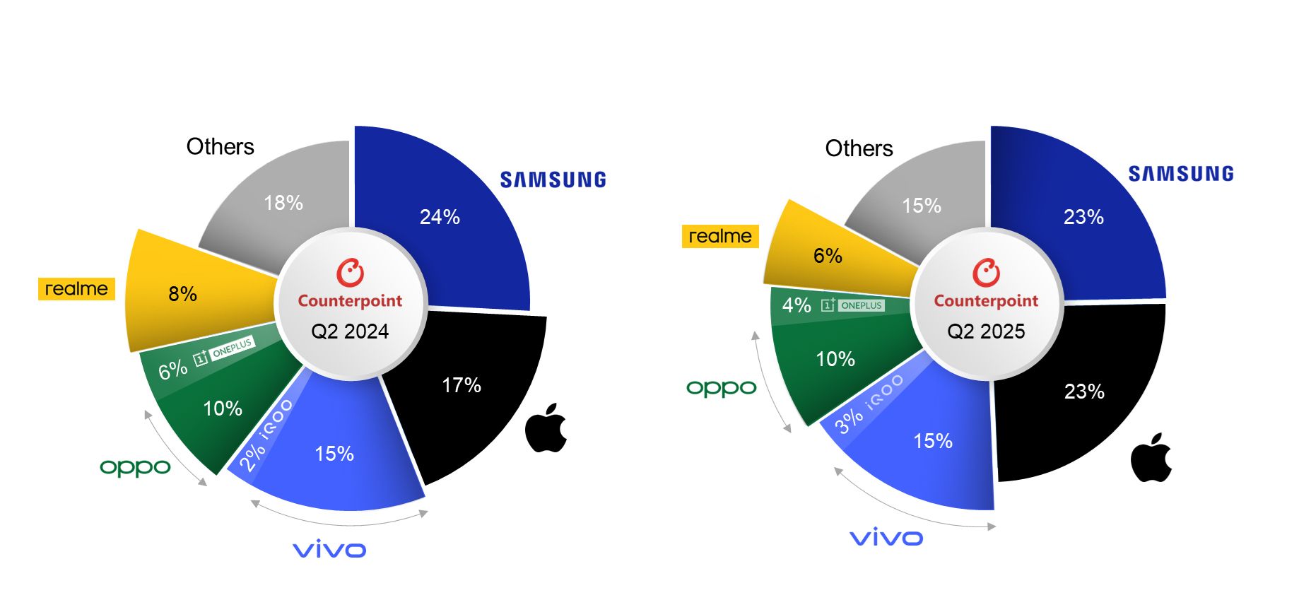 Counterpoint 報告 2025Q2 印度手機市場:vivo 20% 出貨量第一、三星 23% 出貨額居首,iPhone 16 機型出貨量最高
