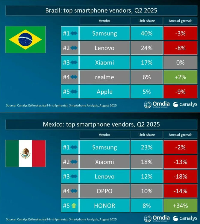 此外,Canalys 還公布了巴西、墨西哥市場的排名情況,均由三星排名第一,聯想、小米進入市場前三。