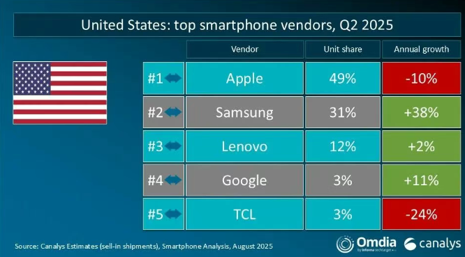 Canalys 報告 2025Q2 全球主要市場手機出貨量:華為中國大陸第一、vivo 印度第一、蘋果美國第一