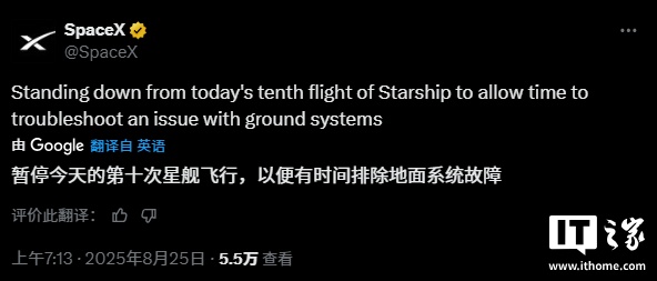 SpaceX:因地面系統(tǒng)故障,暫停今天的第十次星艦試飛