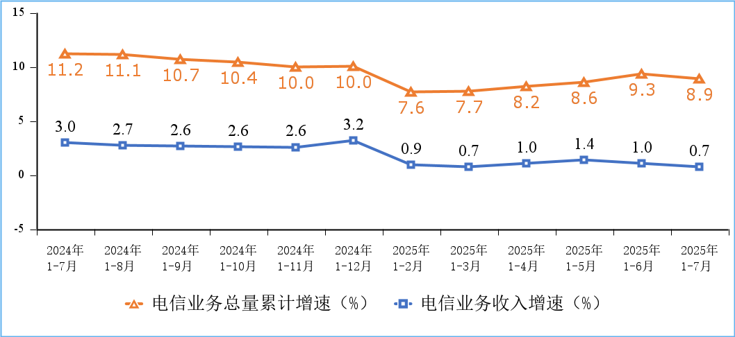 飛象網(wǎng)訊(致新/文)8月27日消息,2025年前7個月,我國通信業(yè)運行總體平穩(wěn),電信業(yè)務(wù)收入累計完成10431億元,同比增長0.7%。按照上年不變價計算的電信業(yè)務(wù)總量同比增長8.9%。