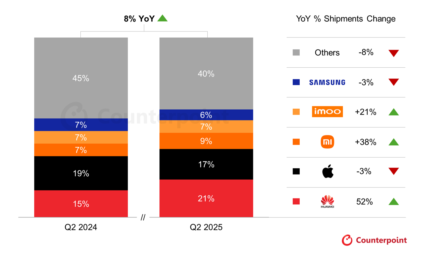 憑借其多樣化的產品組合、強勁的國內勢頭以及中高端產品具有競爭力的價格,華為首次超越蘋果,成為全球出貨量的頭把交椅。