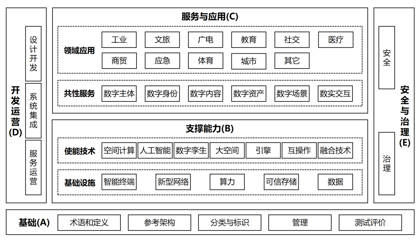 元宇宙標準體系主要包括基礎、支撐能力、服務與應用、開發運營、安全與治理等五大部分,如下圖所示: