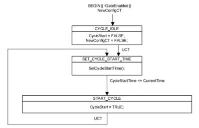 SetCycleStartTime()過程確定下一個GCL執行周期開始的時間。該過程根據Current Time、Oper Base Time、Oper Cycle Time、Oper Cycle Time Extension、Config Change Time和Config Pending的值,將Cycle Start Time變量設置為起始時間,具體規則如下: