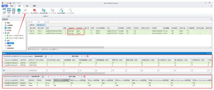 配置AS協議并點擊完成,在配置導航欄中可看到生成的AS協議,點擊啟動所有協議,能看到測試儀Telkerd端口AS時鐘狀態為Slave,Listener端口AS時鐘狀態為Master,統計中能看到時間偏移量及協議包交互數量均正常,時間同步是Qbv調度基準時間的基石,需優先確保其建立成功。