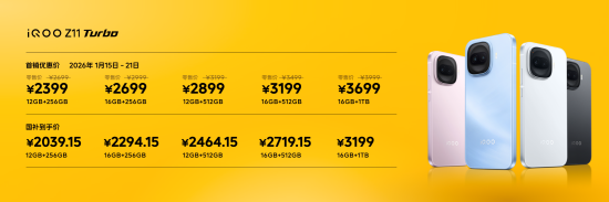 此次 iQOO Z11 Turbo 提供五款存儲版本,首銷優惠價2399元起,疊加國補后低至2039.15元。這款集強性能、好影像、高質感于一體的中端機,將成為跨次元玩家的全能伙伴。