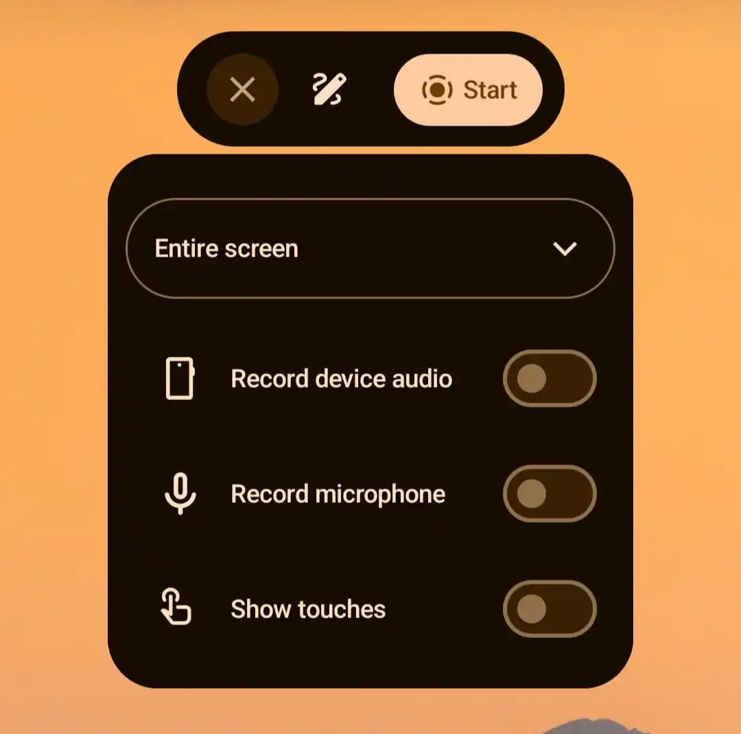 交互方面,新版錄屏工具不再以全屏彈窗形式遮擋視線,而是啟用了一個更為輕量的懸浮膠囊(Floating Pill)界面。用戶在選擇“錄制全屏”后,可快速切換錄制設備音頻、麥克風聲音及顯示觸摸操作等選項。